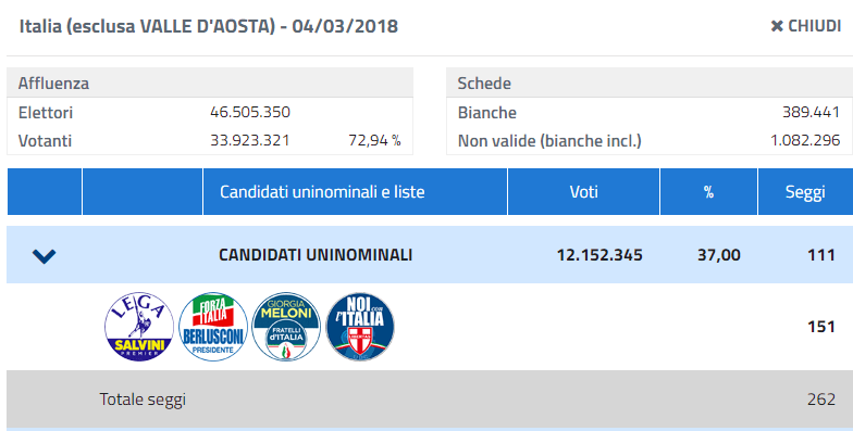 Nel ’18 il centro destra non era compatto; Salvinipirla, preso dalla megalomania che ora è stata fortemente castigata, voleva tutto per sé (appoggiandosi a un’innaturale alleanza coi 5 stelle).